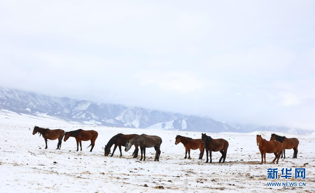 當(dāng)日,受冷空氣影響,位于甘肅省河西走廊中部、祁連山北麓的山丹馬場(chǎng)降雪,馬群在雪原上奔跑覓食,構(gòu)成了一幅壯美高原雪景 。