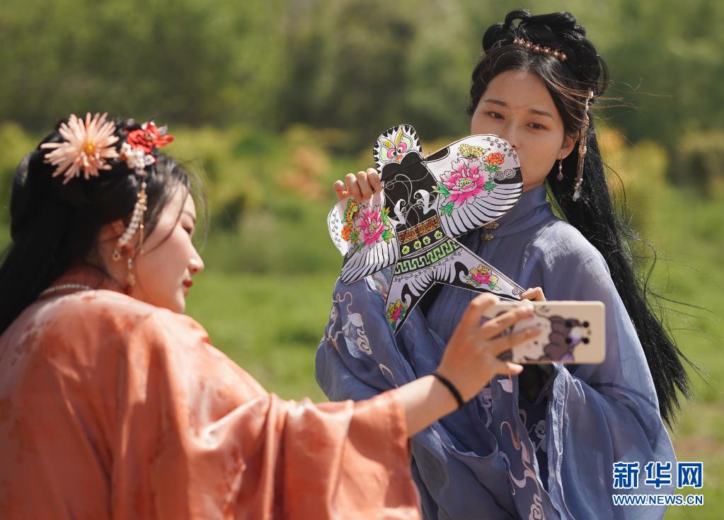 4月10日,人們在第二屆金陵風(fēng)箏會上拍照留念。當(dāng)日,第二屆金陵風(fēng)箏會在江蘇省南京市浦口區(qū)永寧街道舉行。人們放飛風(fēng)箏,歡度快樂時光。新華社記者 季春鵬 攝