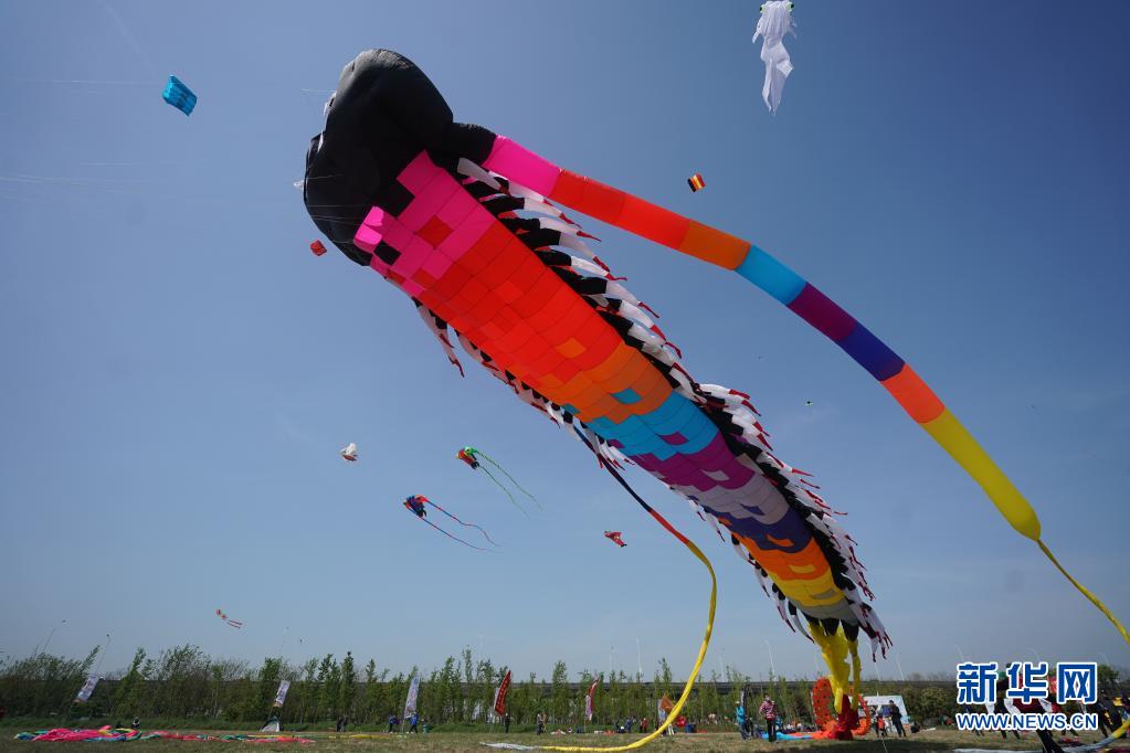 4月10日,人們?cè)诘诙媒鹆觑L(fēng)箏會(huì)上放風(fēng)箏。當(dāng)日,第二屆金陵風(fēng)箏會(huì)在江蘇省南京市浦口區(qū)永寧街道舉行。人們放飛風(fēng)箏,歡度快樂(lè)時(shí)光。新華社記者 季春鵬 攝