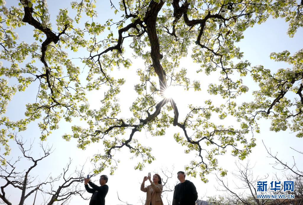 4月11日,游客在遷西縣東蓮花院鎮(zhèn)西山村的梨園內(nèi)拍照。