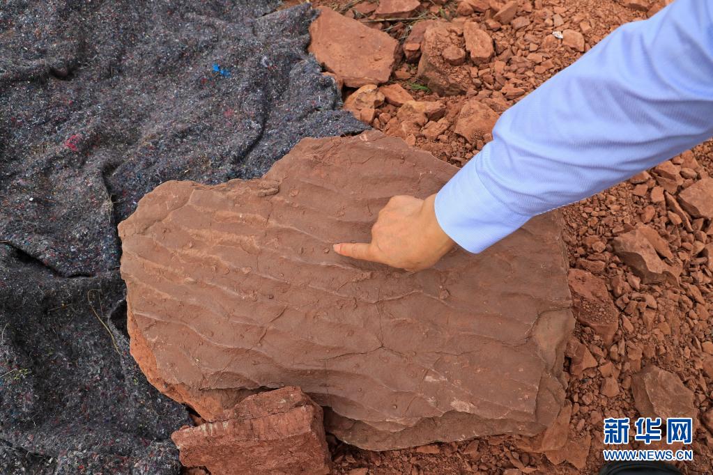 這是波痕沉積結(jié)構(gòu)化石和晚白堊世恐龍同時(shí)期的底棲生物潛穴化石(4月6日攝)。