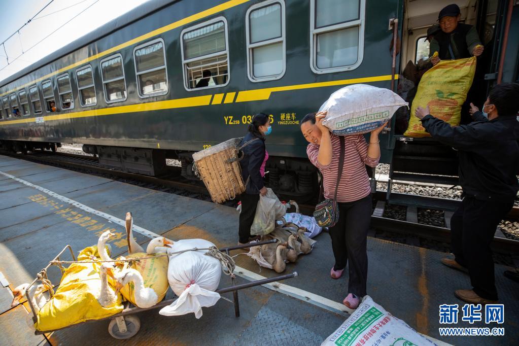 5633次列車(chē)停靠車(chē)站后,彝族小商販忙著把貨卸下來(lái)(4月11日攝)。新華社記者 沈伯韓 攝