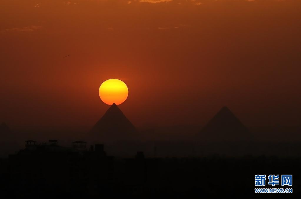 這是4月14日從埃及開(kāi)羅拍攝的吉薩金字塔群日落景色。新華社記者 王東震 攝
