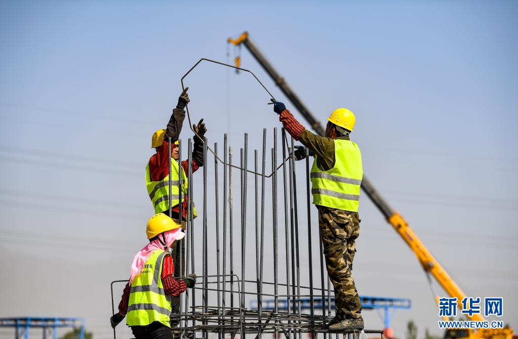 5月1日,寧夏銀川市經(jīng)濟(jì)技術(shù)開發(fā)區(qū)中環(huán)50GW(G12)太陽能級單晶硅材料智慧工廠項(xiàng)目的工人在現(xiàn)場作業(yè)。