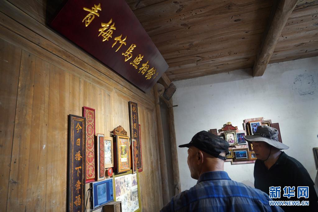 5月1日,參觀者在浮梁縣寒溪村參觀藝術(shù)作品《青梅竹馬照相館》。