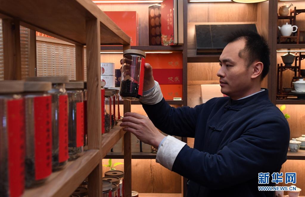 李卓澄在“小茶館”中碼放茶葉(4月29日攝)。新華社記者 任超 攝