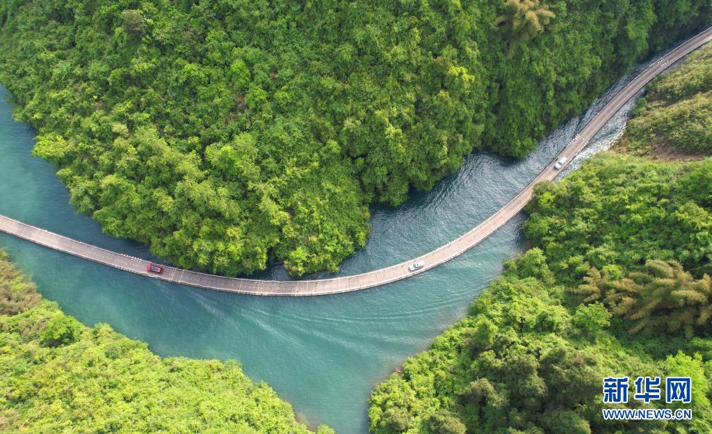 5月2日,游客在湖北省恩施土家族苗族自治州宣恩縣獅子關景區(qū)水上棧道駕車游玩(無人機照片)。新華社發(fā)(王俊 攝)
