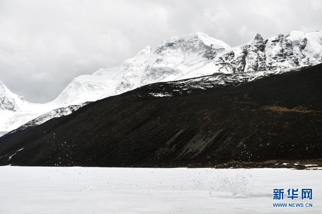 一陣強風(fēng)掠過薩普雪山腳下的冰湖時卷起湖面的薄冰(5月4日攝)。