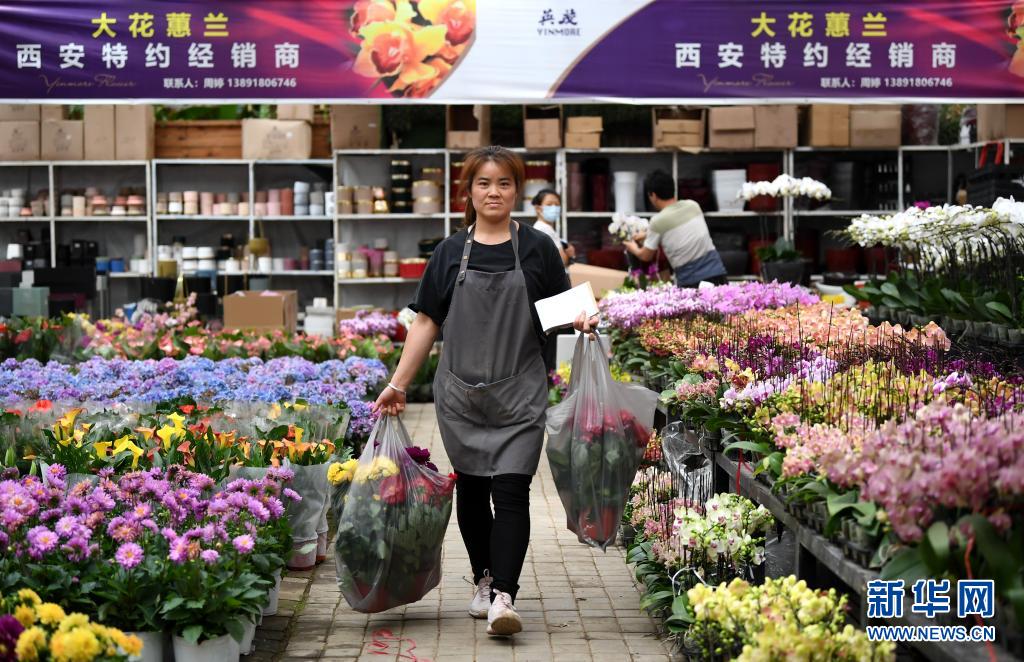 5月7日,在秦嶺花世界現(xiàn)代農(nóng)業(yè)園區(qū),一名銷售人員在打包花卉。