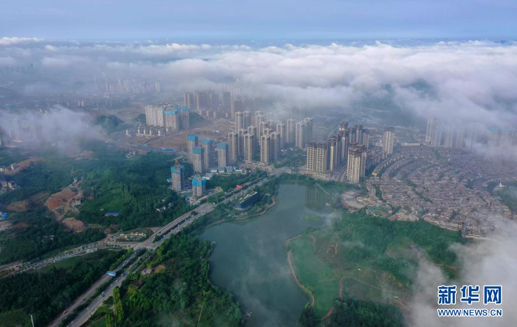 5月8日,貴陽市觀山湖區(qū)的高樓被霧氣籠罩(無人機照片)。
