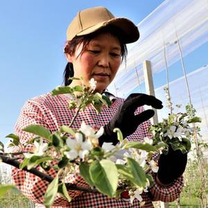 5月9日,在甘肅省平?jīng)鍪徐o寧縣城川鎮(zhèn)一蘋果有機(jī)示范園里,果農(nóng)在疏花。