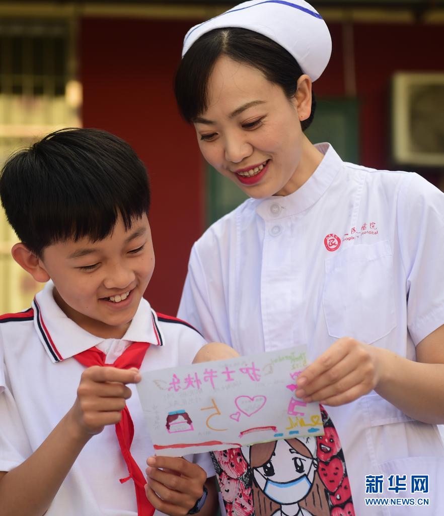 5月11日,河北省滄州市新華區(qū)車站小學(xué)學(xué)生為滄州市人民醫(yī)院的護(hù)士阿姨送上美術(shù)作品,表達(dá)敬意。