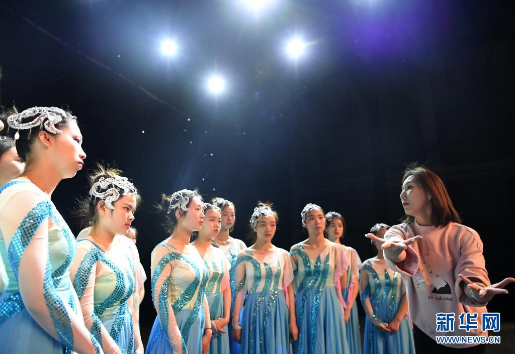 天津理工大學聾人工學院的舞蹈隊員們在學校的劇場里和指導老師交流(5月10日攝)。新華社記者 李然 攝