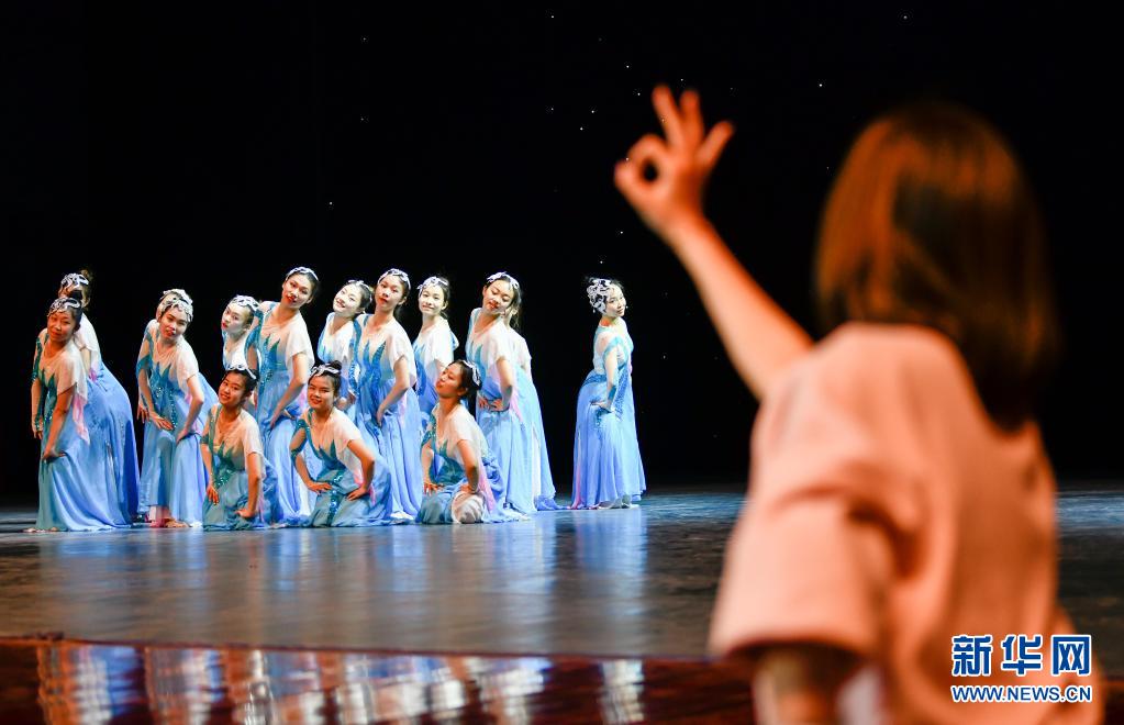 在天津理工大學(xué)的劇場(chǎng)里,天津市殘疾人文藝體育訓(xùn)練指導(dǎo)中心舞蹈老師韓菲用手語(yǔ)為學(xué)生指揮(5月10日攝)。新華社發(fā)(孫凡越攝)