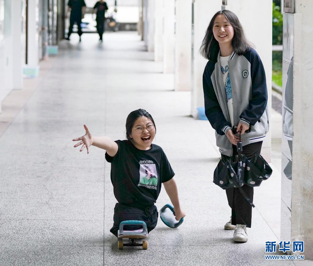 16歲的蔣張子怡是江西上饒中學(xué)高中一年級(jí)的學(xué)生。2010年一場(chǎng)車禍奪去了她的雙腿,如今的她只能依靠滑板代步,用雙手前行,為此,大伙都稱她“滑板姑娘”。