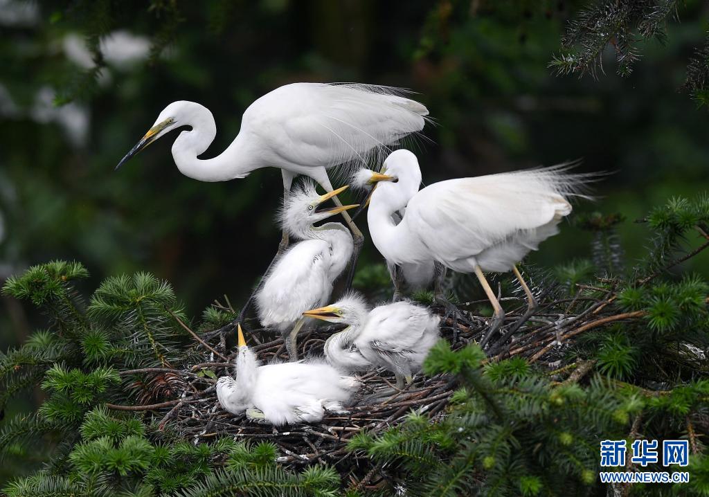 在南昌市新建區(qū)象山森林公園內(nèi),白鷺在給雛鳥(niǎo)喂食(5月18日攝)。