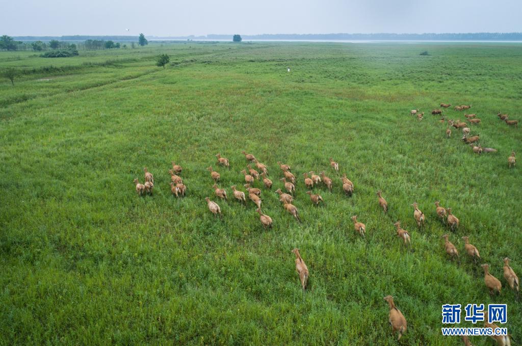 5月17日,一群麋鹿在石首麋鹿國家級自然保護(hù)區(qū)內(nèi)活動(無人機(jī)照片)。新華社記者 肖藝九 攝