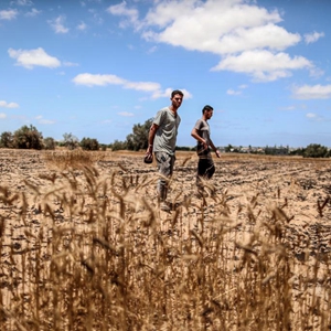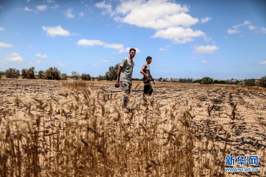 5月22日,在加沙地帶汗尤尼斯,巴勒斯坦農(nóng)民查看被以色列炮擊燒焦的麥田。新華社發(fā)(亞西爾攝)