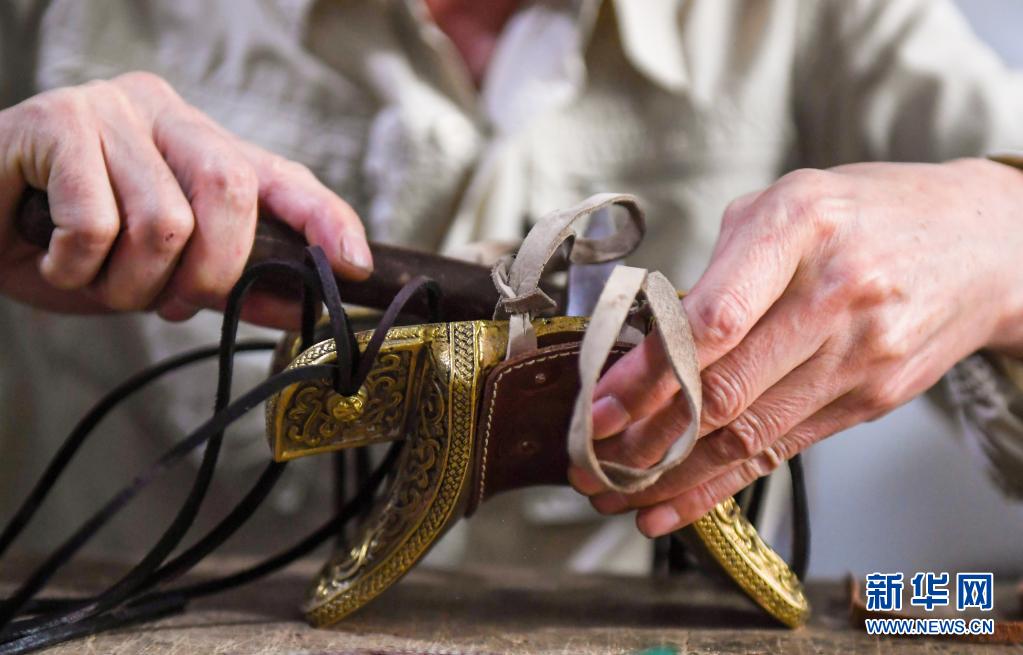 5月26日,錫林虎在工作室內(nèi)制作馬鞍造型的手工藝品。