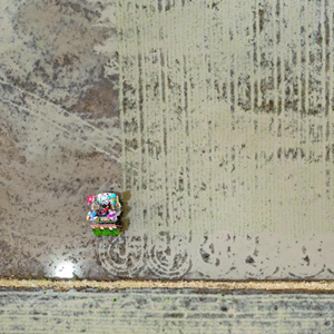 5月27日,在吉林省吉林市永吉縣一拉溪鎮(zhèn)九月豐家庭農(nóng)場,農(nóng)民駕駛農(nóng)機(jī)進(jìn)行水稻插秧(無人機(jī)照片)。
