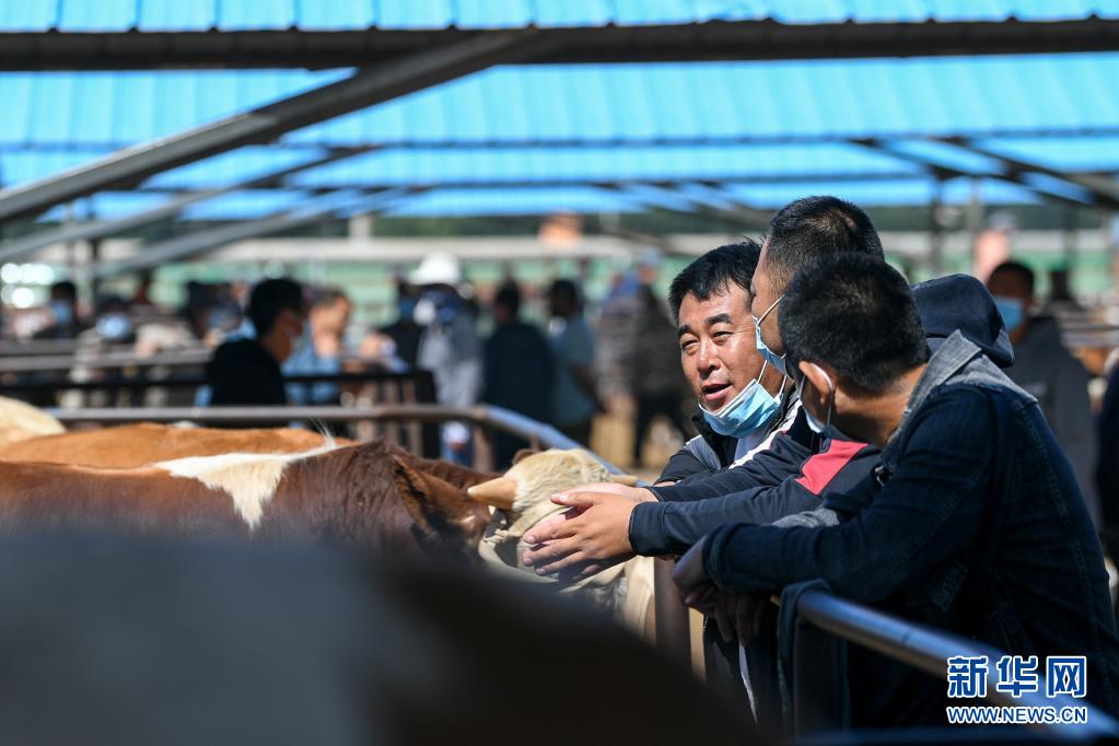 6月1日,交易者在開(kāi)魯牛市交易攤位看牛詢(xún)價(jià)。