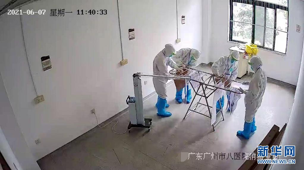 6月7日,廣州市八醫(yī)院嘉禾院區(qū)監(jiān)控畫面顯示,醫(yī)護(hù)人員對(duì)隔離病房考生的試卷、答題卡進(jìn)行二次消毒。新華社發(fā)