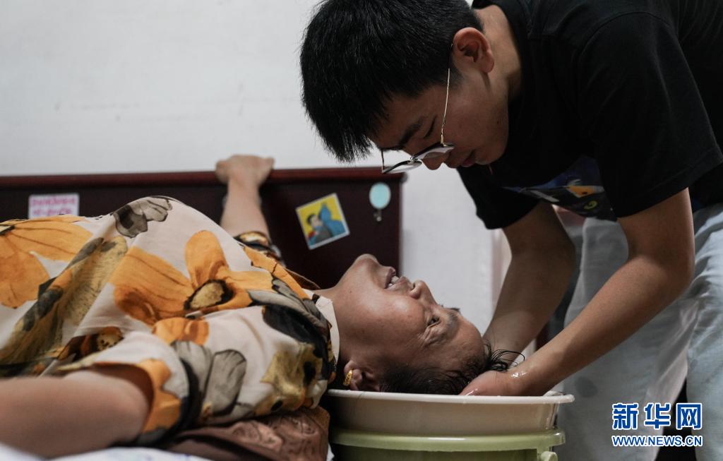 6月1日,趙建軍在宿舍內(nèi)為母親洗頭。新華社記者胡晨歡攝