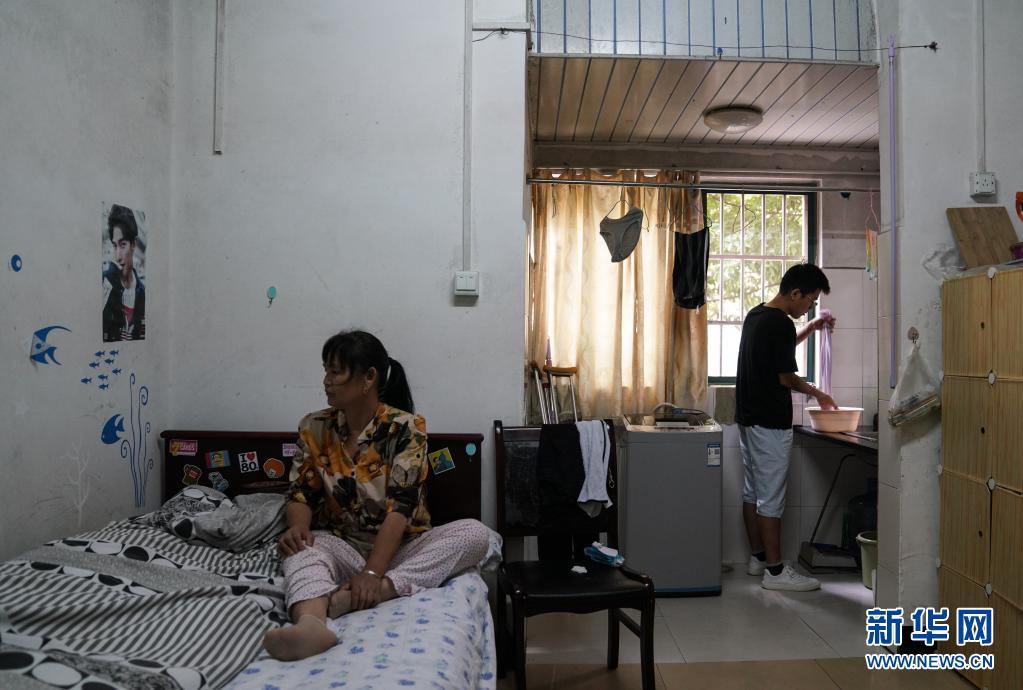 6月1日,趙建軍在宿舍內(nèi)為母親準(zhǔn)備洗臉的毛巾。新華社記者胡晨歡攝