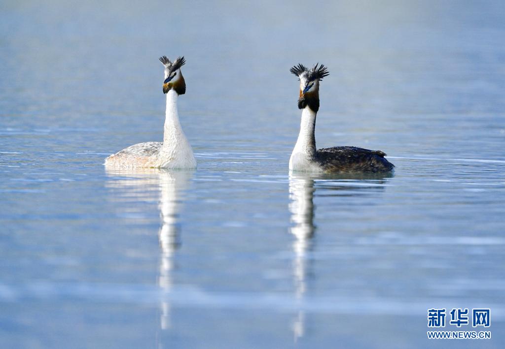 6月14日在拉魯濕地拍攝的兩只鳳頭??。夏日里,鳳頭??和小??在西藏拉薩拉魯濕地國家級(jí)自然保護(hù)區(qū)水面上嬉戲。新華社記者 張汝鋒 攝