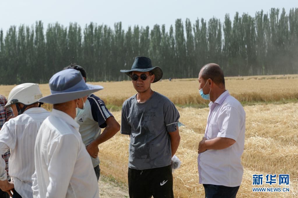 麥客阿地力·沙拉木(右二)在麥田里與麥農(nóng)閑聊(6月19日攝)。新華社記者 高晗 攝