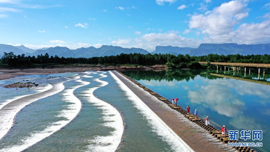 7月6日,市民在浙江省臺(tái)州市仙居縣永安溪白塔鎮(zhèn)段游玩(無人機(jī)照片)。