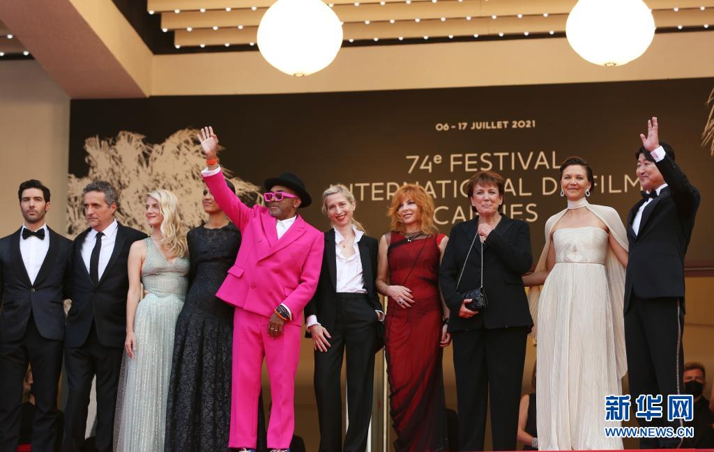 7月6日,第74屆法國戛納國際電影節(jié)主競賽單元評委會主席、美國導(dǎo)演和制片人斯派克·李(左五)攜主競賽單元評委出席開幕式紅毯。