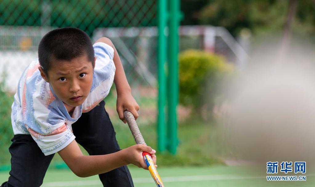 塔城市第二小學(xué)曲棍球隊的小隊員申世豪在訓(xùn)練中(6月11日攝)。