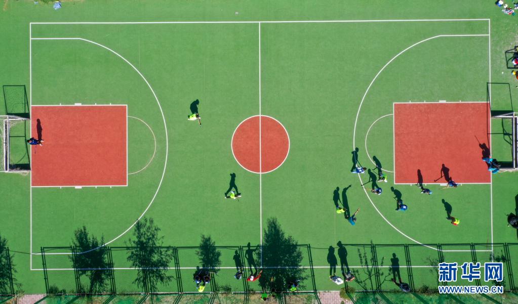 塔城市第二小學(xué)曲棍球隊(duì)的小隊(duì)員利用周末時(shí)間進(jìn)行練習(xí)(6月12日攝,無(wú)人機(jī)照片)。
