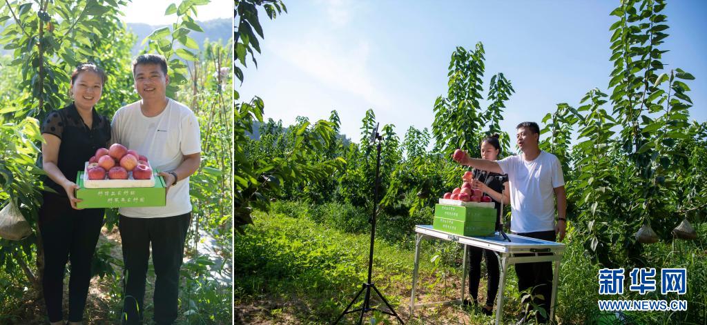 拼版照片:左圖為在山西省吉縣,武偉和妻子梁雪雪展示吉縣蘋果;右圖為武偉和妻子梁雪雪通過(guò)網(wǎng)絡(luò)直播銷售蘋果(7月9日攝)。今年30歲的武偉是山西省洪洞縣武家莊村人,2009年大學(xué)畢業(yè)后,他開過(guò)快遞公司,也做過(guò)微商。期間,他看到來(lái)自家鄉(xiāng)的蘋果存在質(zhì)高價(jià)低、銷售不暢的情況,于是開始通過(guò)電商銷售優(yōu)質(zhì)蘋果。今年以來(lái),武偉和妻子趁著農(nóng)閑嘗試直播帶貨,沒想到短短數(shù)月粉絲量就已過(guò)萬(wàn)。目前,只要天氣允許,他們每天都會(huì)直播兩場(chǎng),日銷售蘋果500余單。