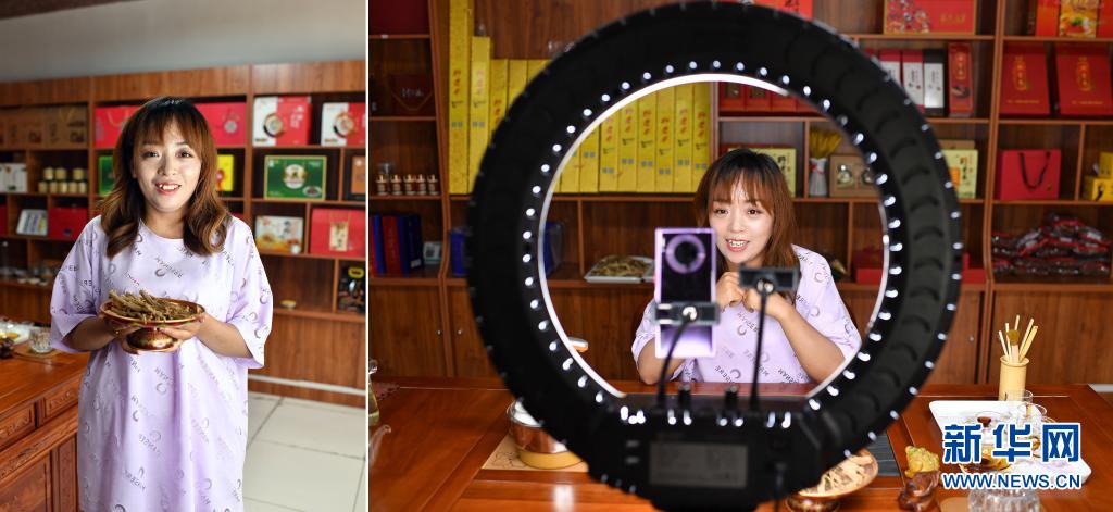 拼版照片:左圖為楊亞飛展示山西省平順縣產(chǎn)的黨參;右圖為楊亞飛通過網(wǎng)絡(luò)直播介紹黨參(7月9日攝)。今年31歲的楊亞飛是平順縣白家莊村人,2013年,懷著發(fā)展電子商務(wù)的夢想,楊亞飛回到家鄉(xiāng)做起了電商。從只有幾件商品,到上線100多種農(nóng)副產(chǎn)品,楊亞飛創(chuàng)辦的網(wǎng)店從無到有,逐漸壯大。借助網(wǎng)絡(luò)的力量,楊亞飛銷售的核桃、花椒、黨參、柿餅、黑棗等當?shù)赝撂禺a(chǎn)賣到了全國各地。