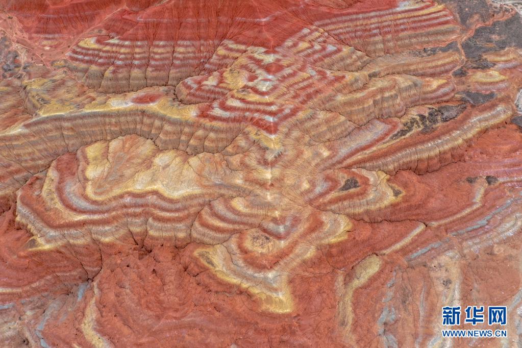 張掖世界地質(zhì)公園一處彩色丘陵地貌呈現(xiàn)出“五彩祥云”景象(7月14日攝,無人機(jī)照片)。