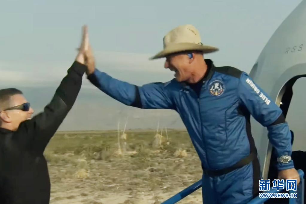 這張美國藍色起源公司7月20日發(fā)布的視頻截圖顯示,“新謝潑德”飛行器在美國得克薩斯州西部著陸后,該公司創(chuàng)始人杰夫·貝索斯(右)走出飛行器慶祝。