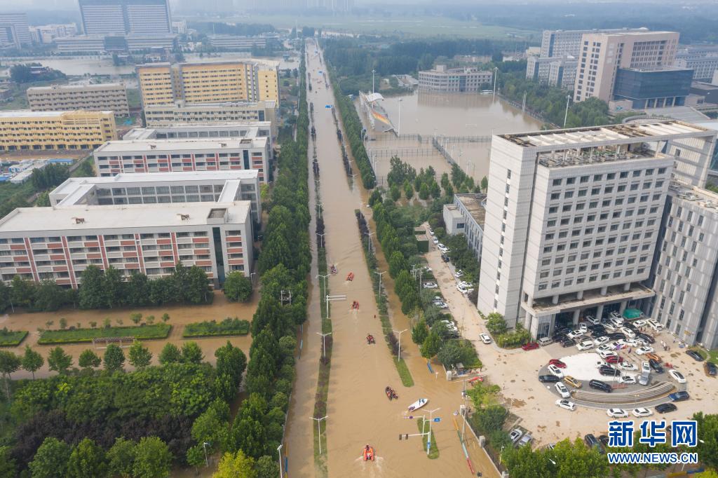 7月22日,在阜外華中心血管病醫(yī)院附近的錦繡路與鄭開(kāi)大道交叉口,救援人員利用舟艇轉(zhuǎn)移人員(無(wú)人機(jī)照片)。