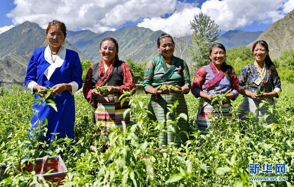 林芝市朗縣洞嘎鎮(zhèn)滾村的村民展示剛剛采摘的辣椒(2020年7月27日攝)。