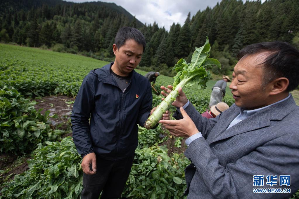 8月13日,在四川省阿壩藏族羌族自治州紅原縣刷經(jīng)寺鎮(zhèn)加當(dāng)村,農(nóng)業(yè)技術(shù)推廣研究員茍?。ㄇ坝遥┰诓榭词斋@的萵筍生長(zhǎng)情況。