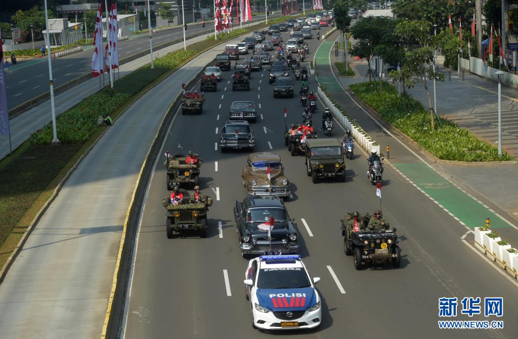 8月17日,參加印度尼西亞獨立日慶祝的車輛行駛在雅加達街頭。8月17日是印度尼西亞獨立日。新華社發(fā)(祖卡南攝)