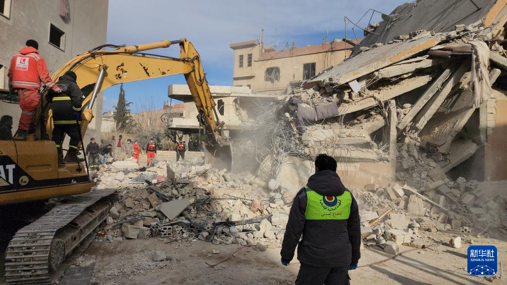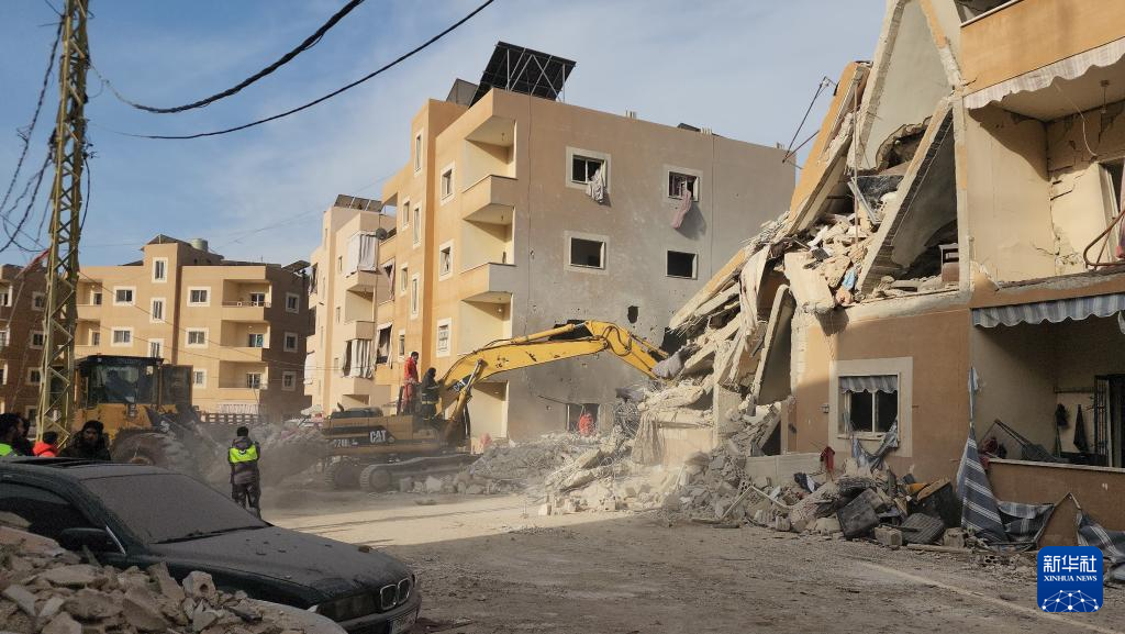3月4日,在黎巴嫩巴勒贝克,救援人员在遭以军袭击的居民楼废墟上展开救援。