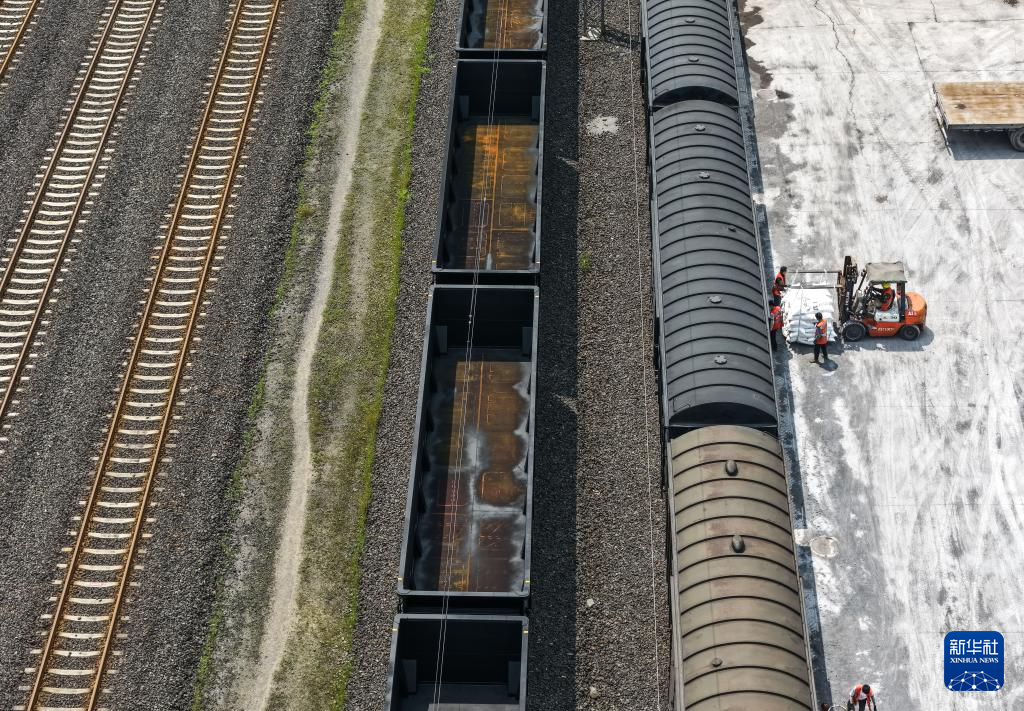 4月16日,在贵州瓮马铁路牛场站,中铁二十局瓮马铁路运营分公司的工人在转运化肥原材料(无人机照片)。