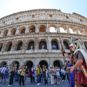 4月19日,在意大利罗马斗兽场附近,男子身着传统服饰参加盛装游行。