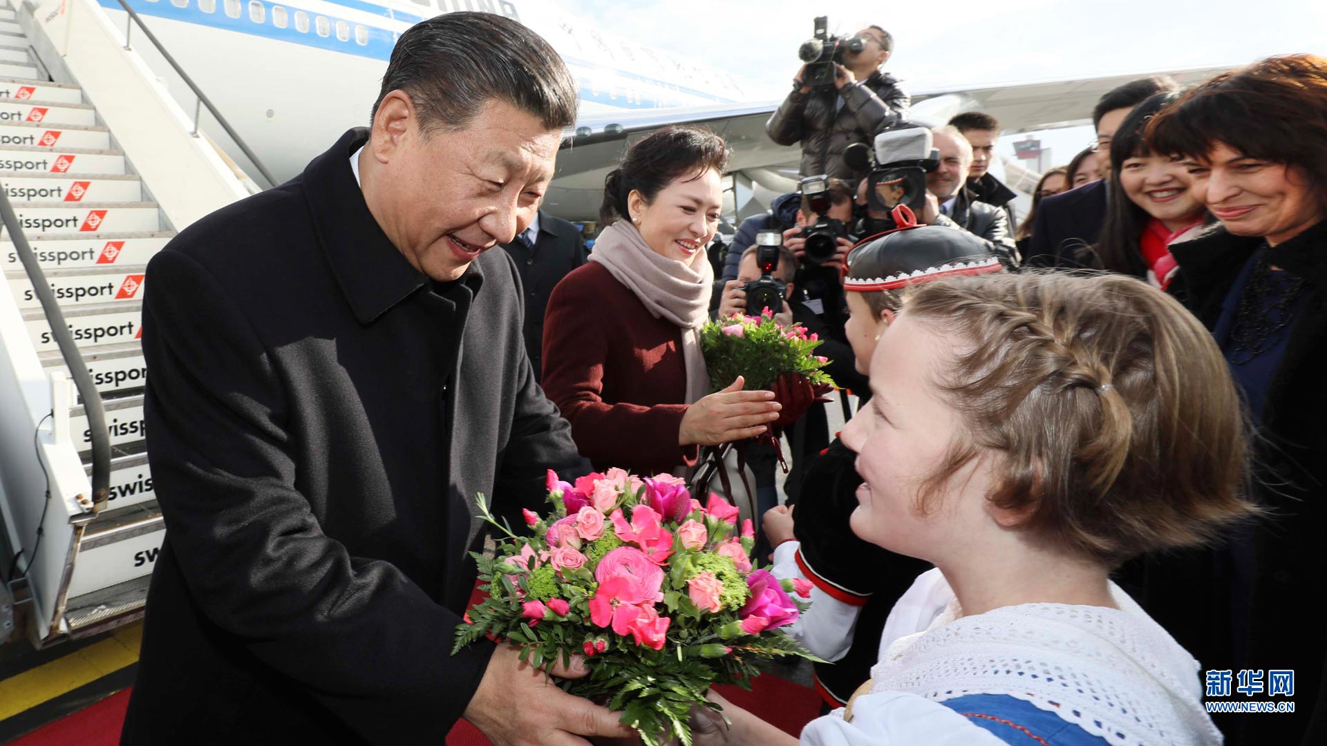 1月15日,國家主席習近平乘專機抵達蘇黎世,開始對瑞士聯(lián)邦進行國事訪問。這是當?shù)貎和蛄暯胶头蛉伺睇愭芦I上鮮花。新華社記者蘭紅光攝2017-01-16