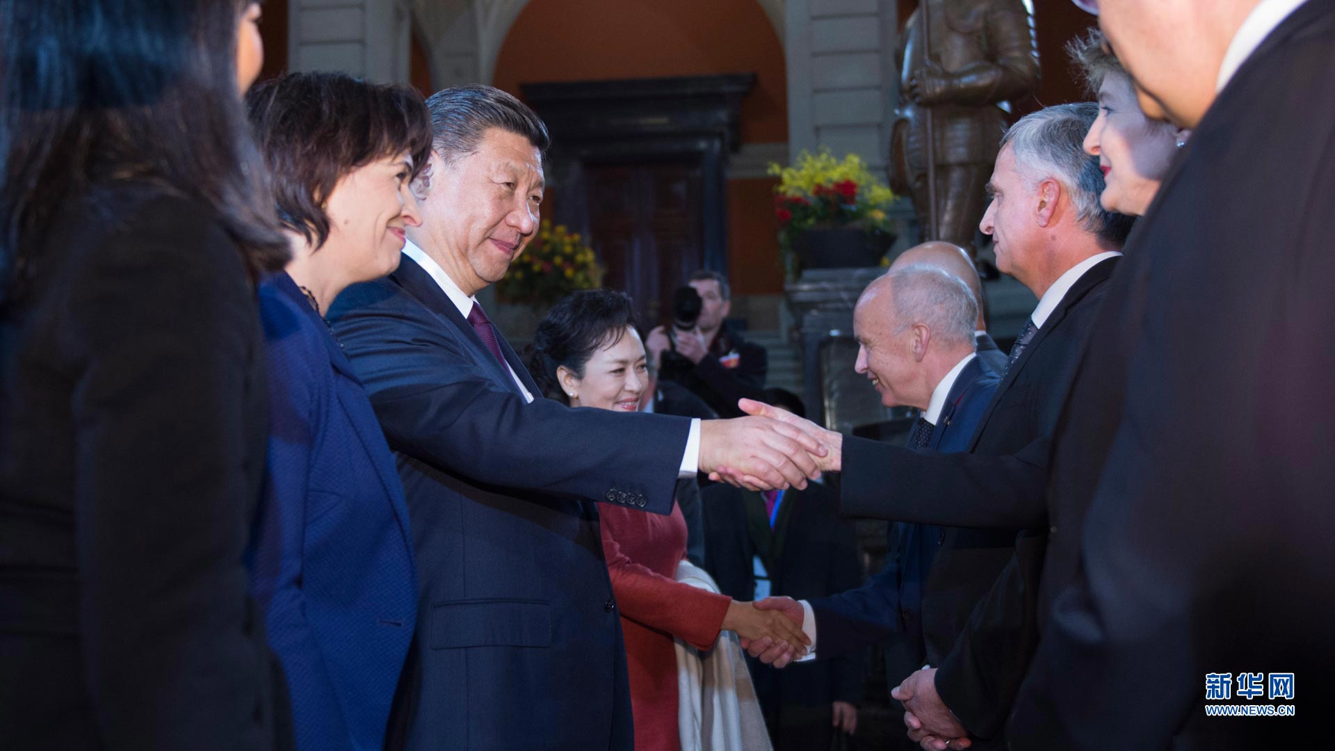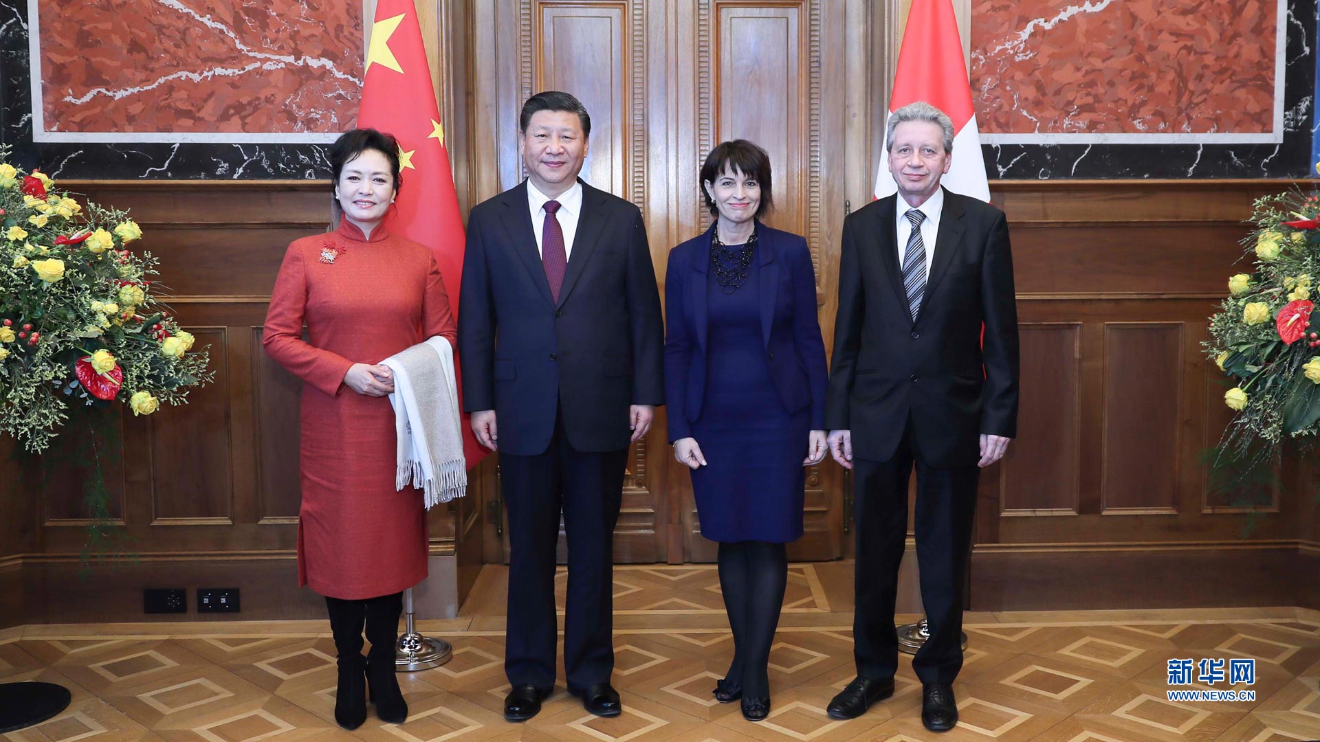 1月15日,國家主席習近平在伯爾尼出席瑞士聯(lián)邦委員會全體委員集體舉行的迎接儀式并致辭。這是瑞士聯(lián)邦主席洛伊特哈德夫婦在聯(lián)邦大廈迎接習近平和夫人彭麗媛。 新華社記者蘭紅光攝2017-01-16