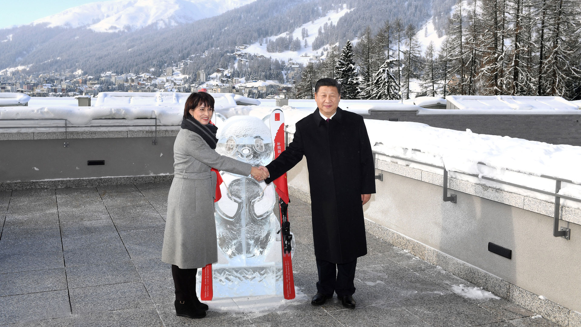 1月17日,國家主席習近平同瑞士聯(lián)邦主席洛伊特哈德在達沃斯共同啟動中瑞旅游年。兩國元首在熊貓冰雕像和印有中瑞兩國國旗及“中瑞旅游年”字樣的滑雪板旁合影留念。新華社記者 丁林 攝2017-01-18