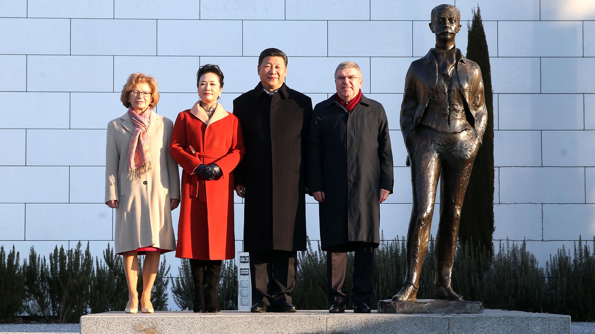 1月18日,國家主席習近平在瑞士洛桑國際奧林匹克博物館會見國際奧林匹克委員會主席巴赫。這是習近平和夫人彭麗媛與巴赫夫婦在現(xiàn)代奧林匹克運動發(fā)起人顧拜旦雕像前合影。新華社記者 姚大偉 攝2017-01-19