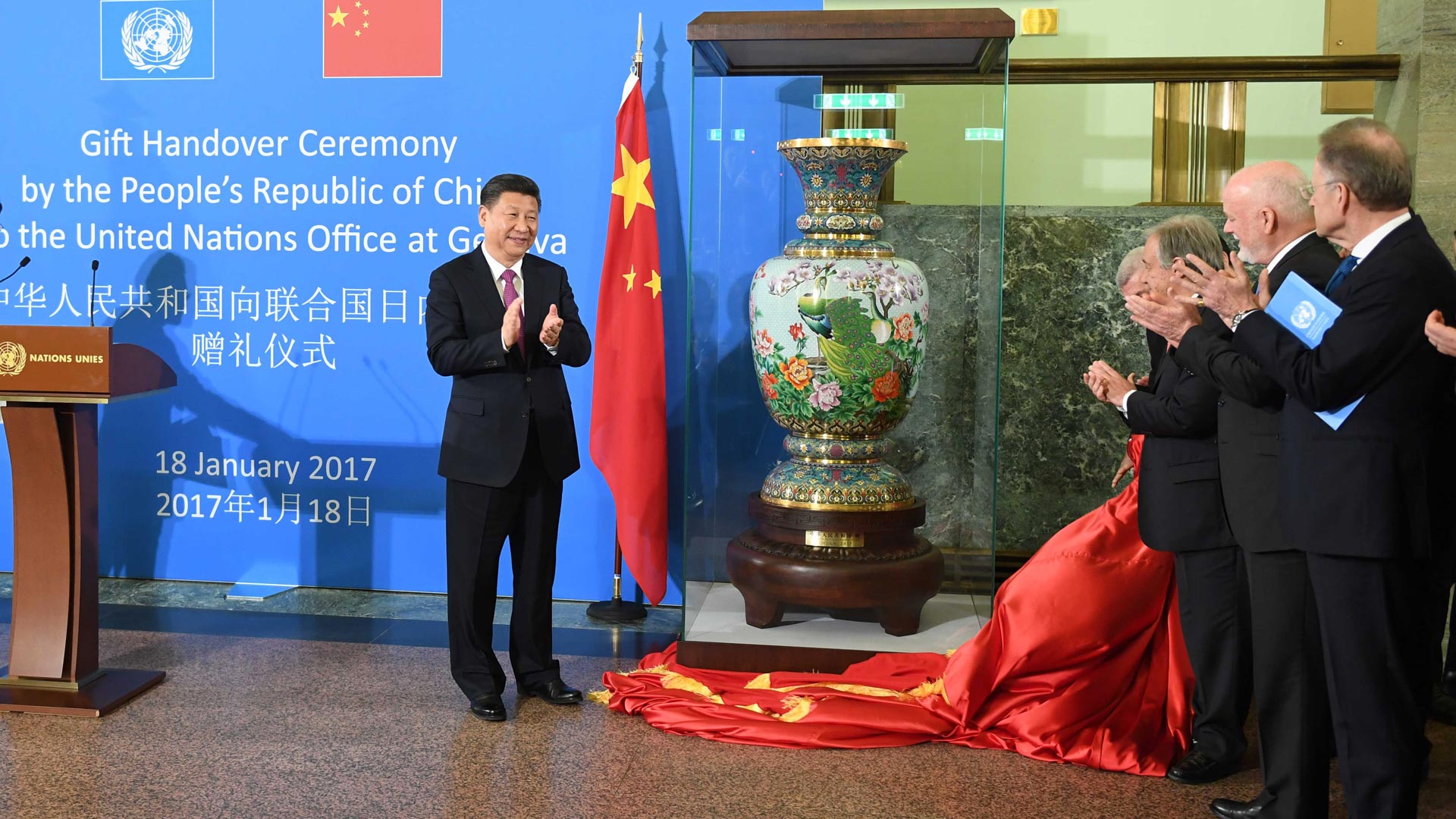 1月18日,國家主席習近平在瑞士日內(nèi)瓦萬國宮出席“共商共筑人類命運共同體”高級別會議,并發(fā)表題為《共同構(gòu)建人類命運共同體》的主旨演講。這是會議結(jié)束后,習近平出席中國向聯(lián)合國日內(nèi)瓦總部贈禮儀式。新華社記者 張鐸 攝2017-01-19